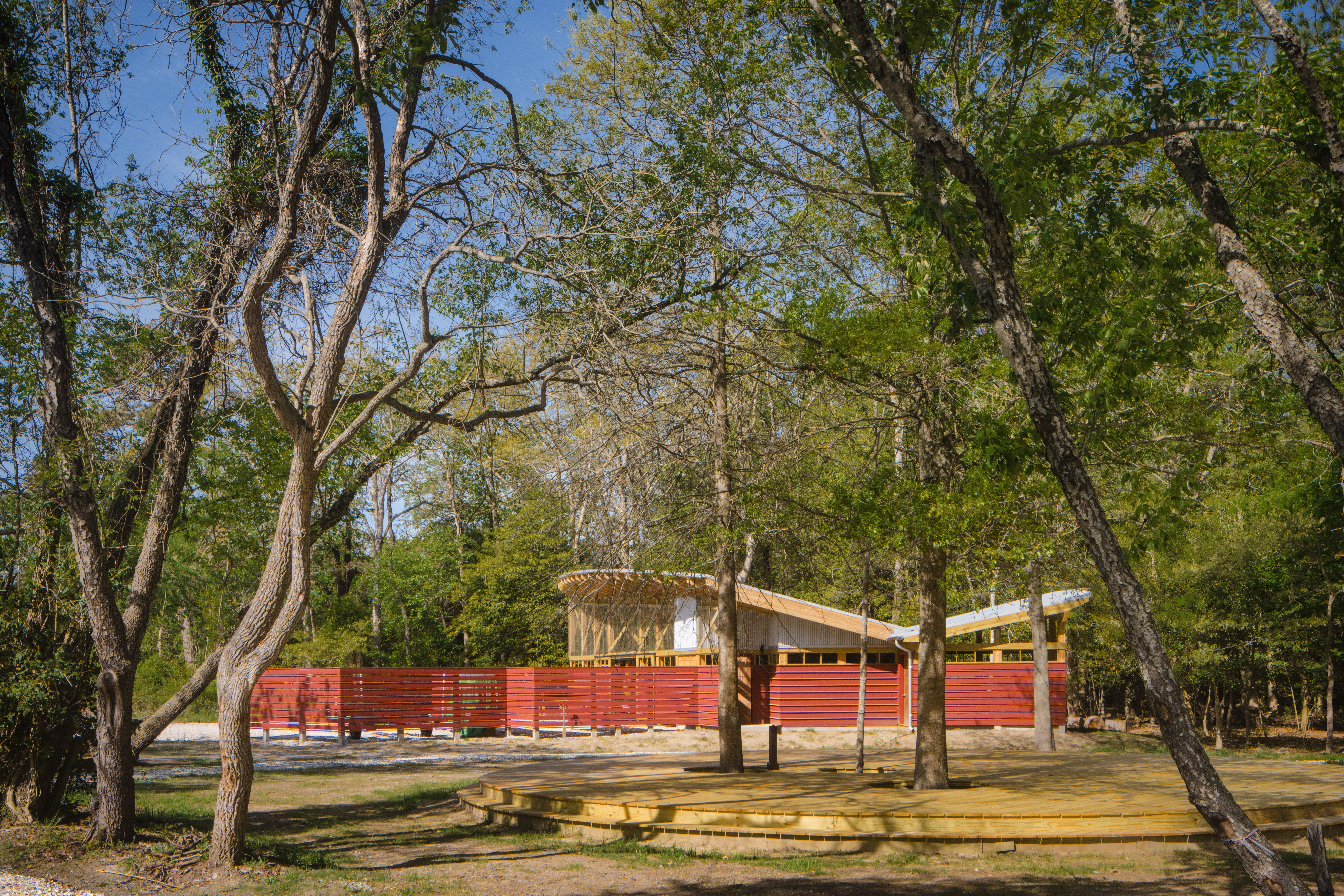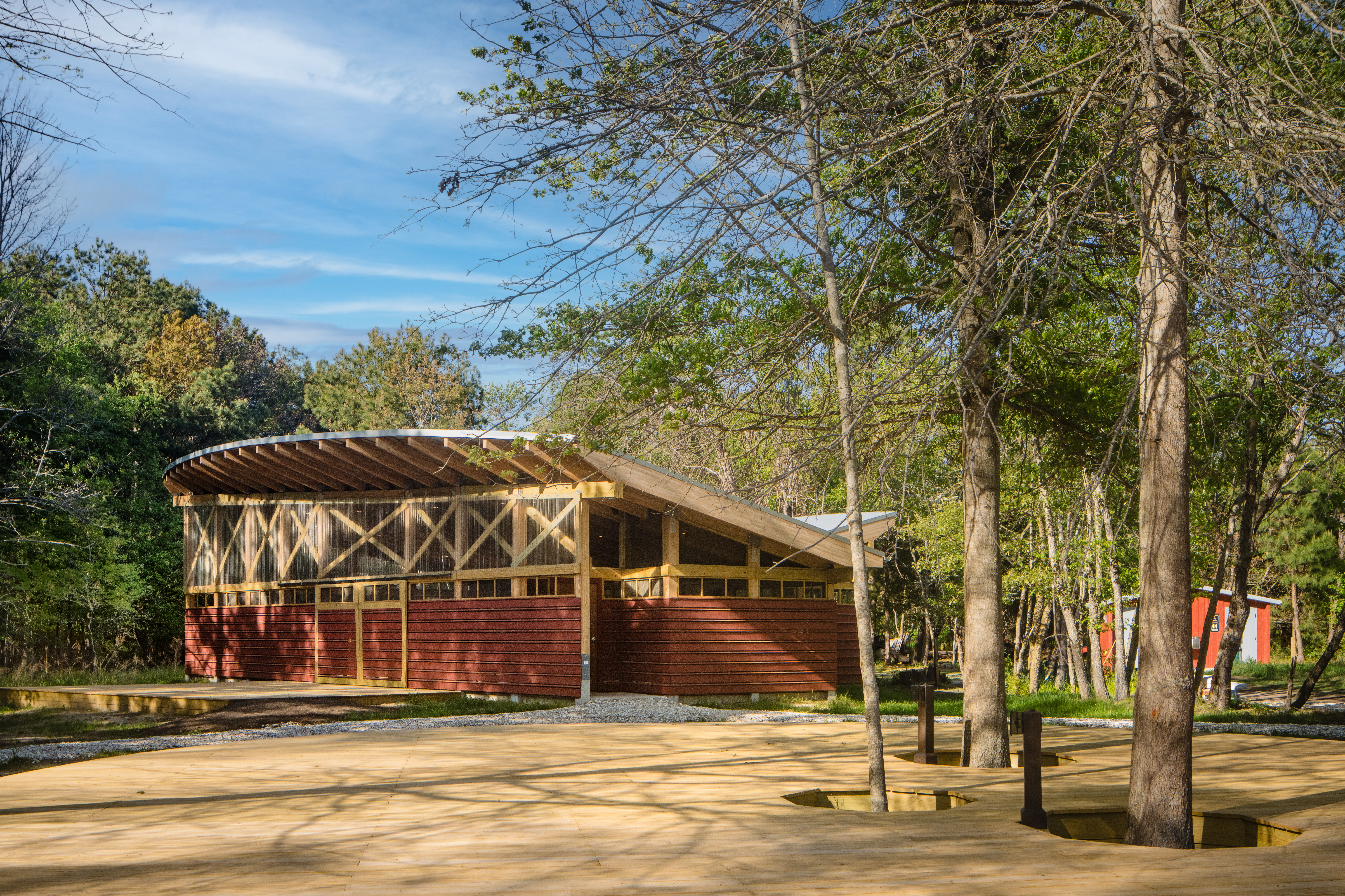 Buildings were constructed with glue-laminated timber frames, barn-style siding, and metal roofs, incorporating inverted roof curves and skewed layouts that required precise field installation of thirty columns per building and custom-fabricated roof supports. Exterior finishes, including T1-11 siding, skip-cladding, and polycarbonate panels, were carefully crafted onsite to maximize natural light, airflow, and sustainability. Outdoor features, such as decks, amphitheater seating, and rainwater collection systems, reinforce the preserve’s ecological mission.